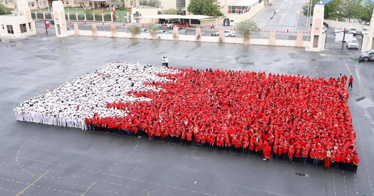 പ്രൈമറി, കിന്റര്ഗാര്ട്ടന് വിഭാഗങ്ങളില് നിന്നുള്ള 3,700 വിദ്യാര്ത്ഥികള് ബഹ്റൈന് ദേശീയ പതാകയുടെ മനുഷ്യ ചിത്രീകരണത്തില് പങ്കെടുത്തു. ഇത് ഐക്യം, ദേശീയ അഭിമാനം, രാജ്യത്തോടുള്ള ആദരവ് എന്നിവയെ പ്രതീകപ്പെടുത്തുകയും സ്കൂളിന്റെ പ്ലാറ്റിനം ജൂബിലി ആഘോഷങ്ങള്ക്ക് തിളക്കം നല്കുകയും ചെയ്തു. ആഷാത്-അല് ബഹ്റൈന്, വി ലവ് ബഹ്റൈന്, ഹമാര ബഹ്റൈന് മഹാന് എന്നിവയായിരുന്നു മുദ്രാവാക്യങ്ങള്.