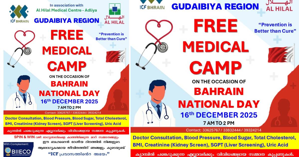 BAHRAIN ബഹ്റൈന് ദേശീയ ദിനത്തില് ഐസിഎഫ് സൗജന്യ മെഡിക്കല് ക്യാമ്പ് സംഘടിപ്പിക്കുന്നു Admin December 15, 2025 4:18 pm