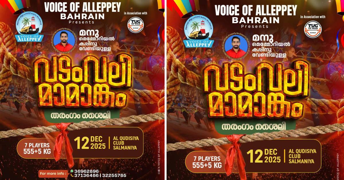 BAHRAIN വോയ്സ് ഓഫ് ആലപ്പി വടം വലി മത്സരം സംഘടിപ്പിക്കുന്നു; പോസ്റ്റര് പ്രകാശനം ചെയ്തു Admin November 28, 2025 4:47 pm