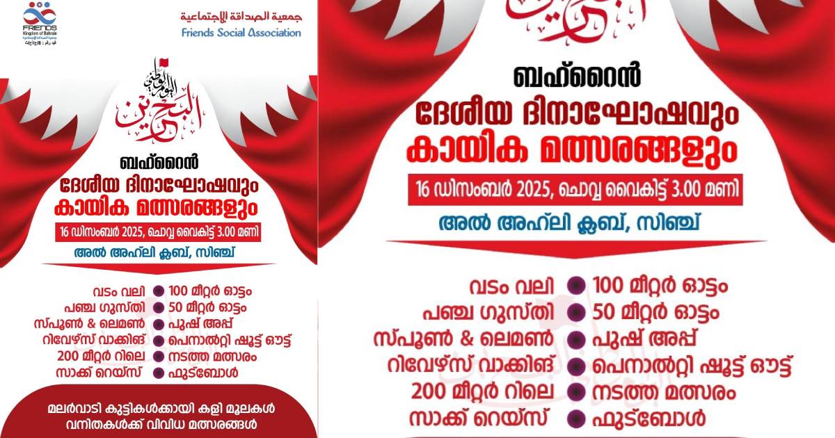 BAHRAIN ഫ്രന്ഡ്സ് അസോസിയേഷന് ബഹ്റൈന് ദേശീയ ദിനാഘോഷം സംഘടിപ്പിക്കുന്നു Admin December 14, 2025 8:29 pm