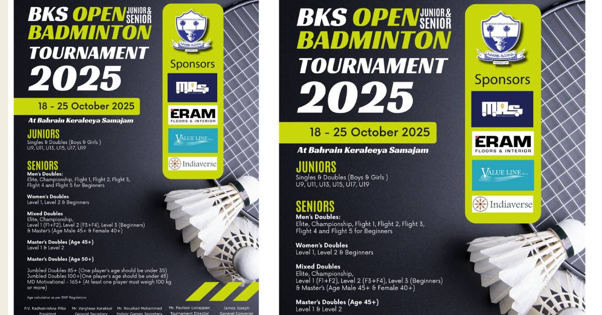BAHRAIN രണ്ടാമത് ബികെഎസ് ഓപ്പണ് ജൂനിയര് & സീനിയര് ബാഡ്മിന്റണ് ടൂര്ണമെന്റ് 18 മുതല് Admin October 6, 2025 4:44 pm