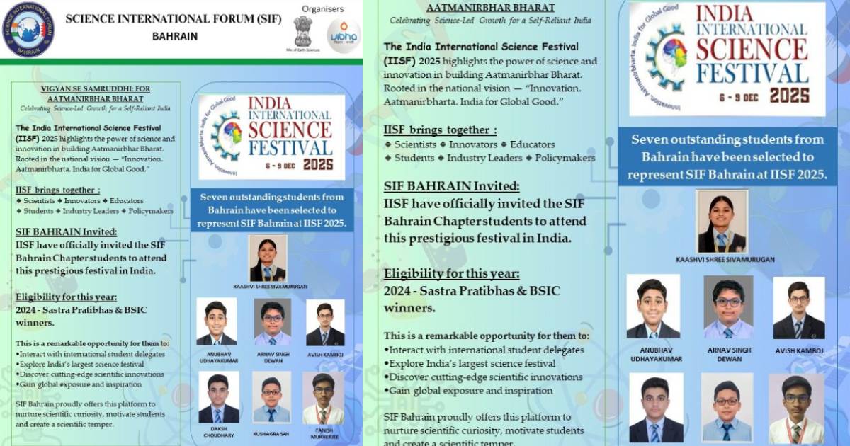 BAHRAIN ഇന്ത്യ ഇന്റര്നാഷണല് സയന്സ് ഫെസ്റ്റിവല്; ബഹ്റൈനിനെ പ്രതിനിധീകരിച്ച് 7 പേര് പങ്കെടുക്കും Admin December 2, 2025 6:30 pm