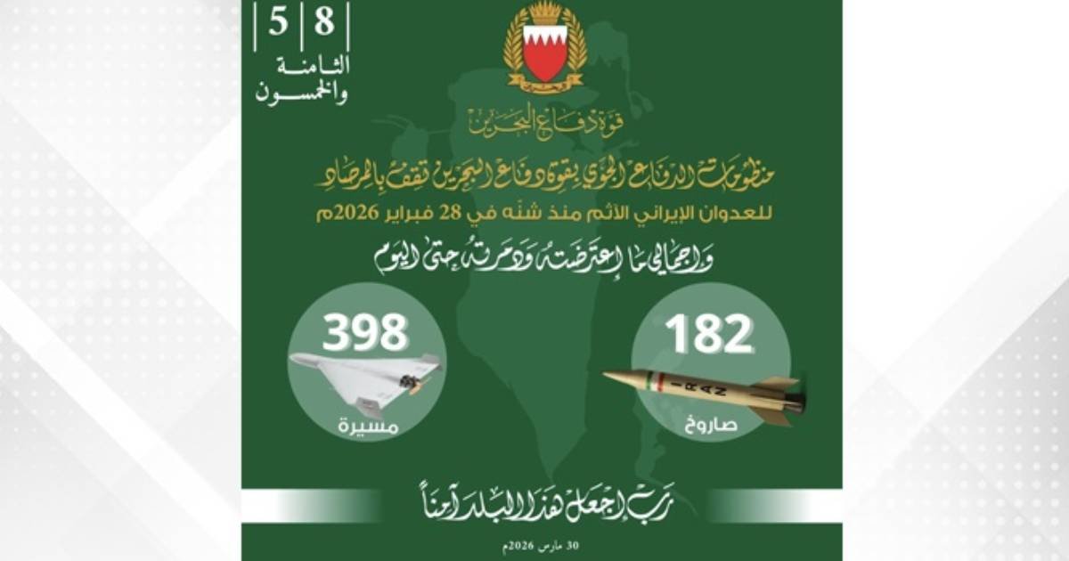 BAHRAIN ബഹ്റൈൻ വ്യോമപ്രതിരോധം ശക്തം; ഇതുവരെ 182 മിസൈലുകളും 398 ഡ്രോണുകളും തകർത്തു Admin March 30, 2026 5:39 pm
