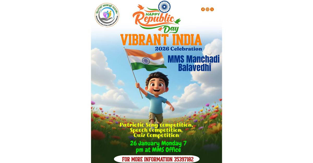 BAHRAIN റിപ്പബ്ലിക് ദിനാഘോഷം: മുഹറഖ് മലയാളി സമാജം ‘വൈബ്രന്റ് ഇന്ത്യ’ സംഘടിപ്പിക്കുന്നു Admin January 25, 2026 9:28 pm