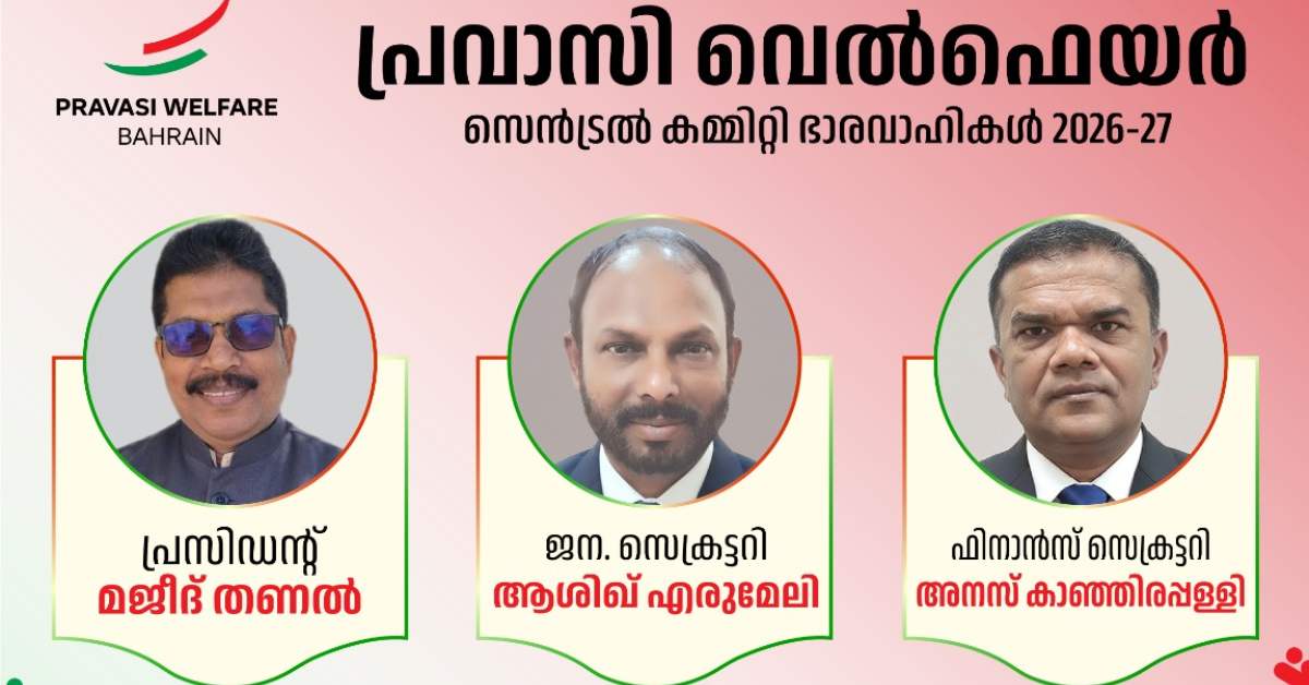 BAHRAIN പ്രവാസി വെൽഫെയറിന് പുതിയ നേതൃത്വം: മജീദ് തണൽ പ്രസിഡന്റ്, ആഷിക് എരുമേലി ജനറൽ സെക്രട്ടറി Admin January 13, 2026 3:04 pm