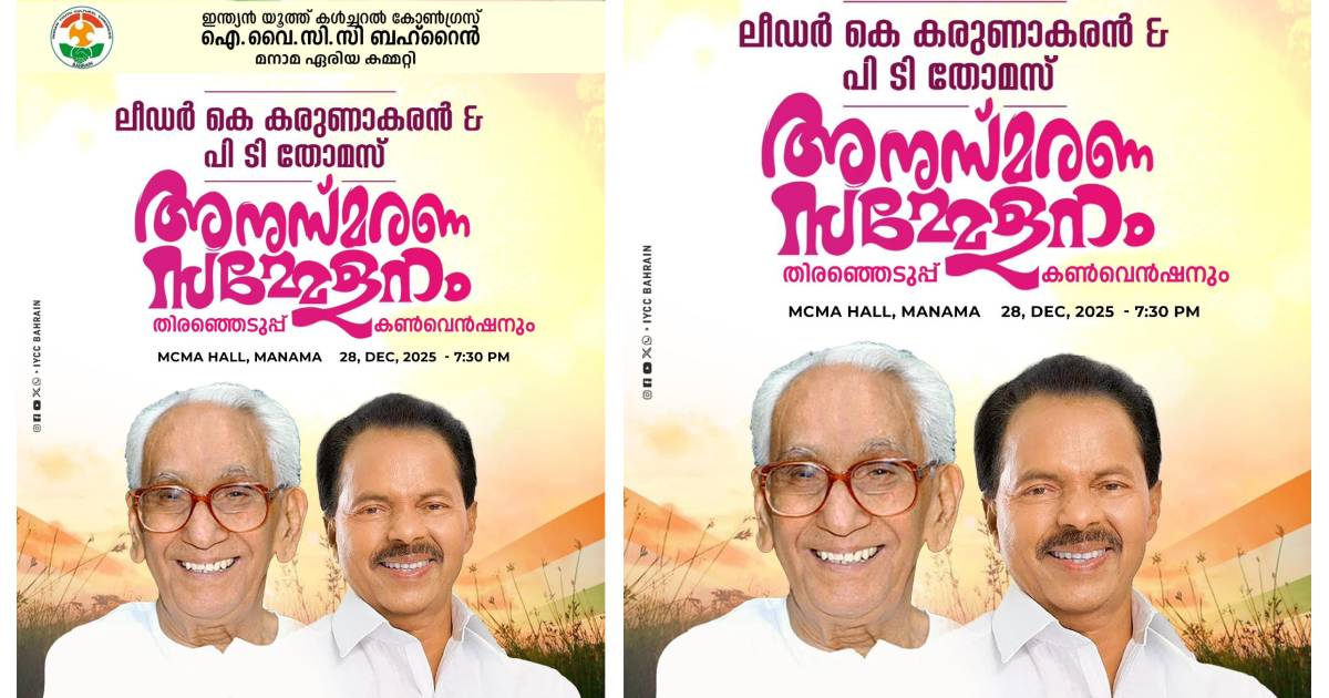 BAHRAIN കെ കരുണാകരന്, പി ടി തോമസ് അനുസ്മരണവും തെരഞ്ഞെടുപ്പ് കണ്വന്ഷനും Admin December 28, 2025 5:30 pm