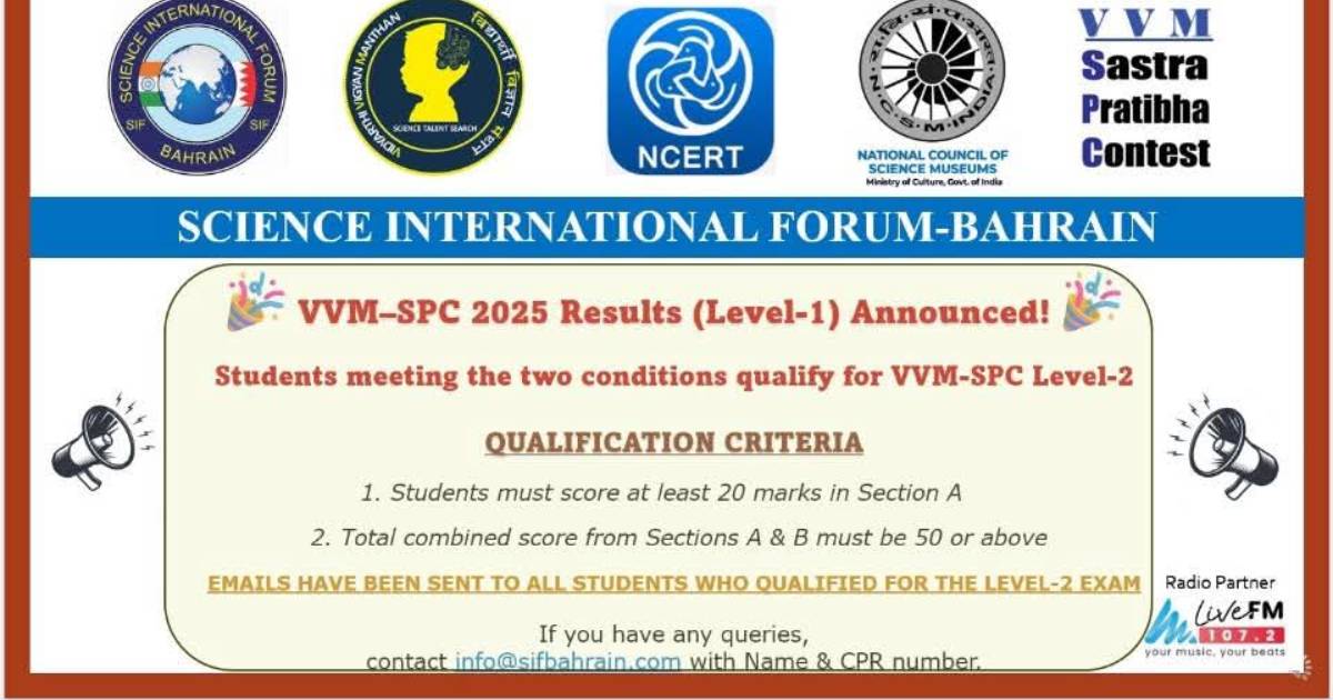 BAHRAIN വിവിഎം-എസ്പിസി 2025 പ്രാഥമിക തല പരീക്ഷാഫലങ്ങള് പ്രഖ്യാപിച്ചു Admin November 24, 2025 7:03 pm